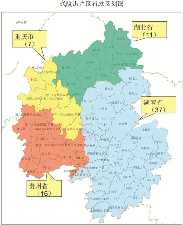 武陵山片区包括湖北、湖南、重庆、贵州四省市交界地区的71个县(市、区)。