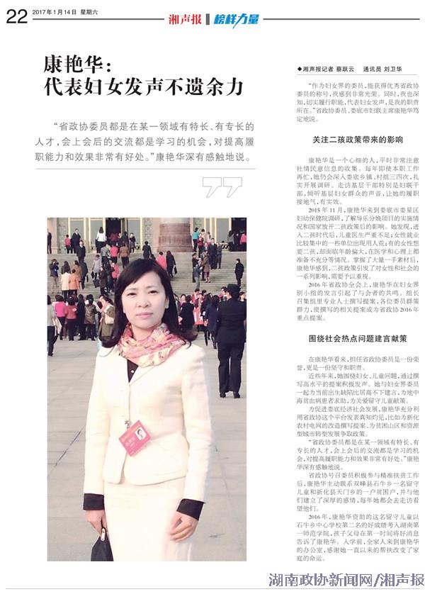 “作为妇女界的委员,能获得优秀省政协委员的称号,我感到非常光荣。同时,我也深知,切实履行职能,代表妇女发声,是我的职责所在。”省政协委员、娄底市妇联主席康艳华笃定地说。