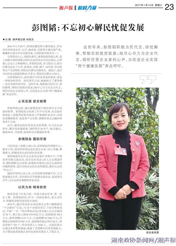 这些年来,彭图韬积极为民代言,排忧解难,帮助百姓脱贫致富;她尽心尽力为企业代言,倾听民营企业家的心声,为促进企业实现“两个健康发展”奔走呼吁。