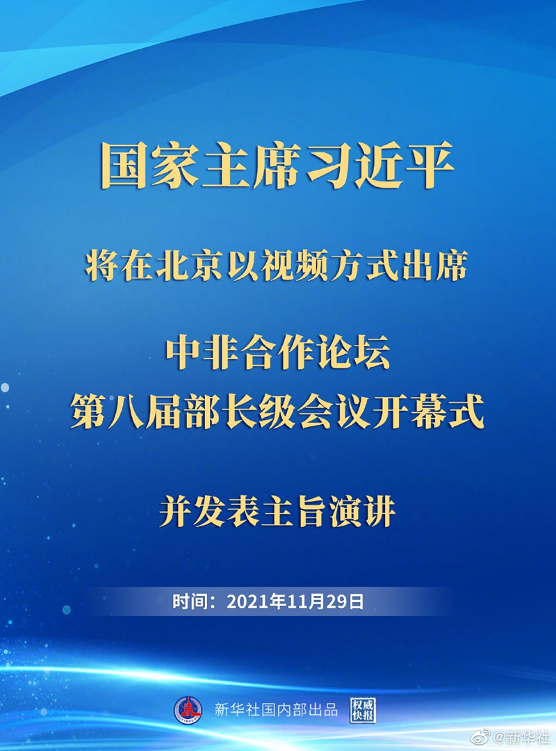 新华社北京11月26日电 外交部发言人华春莹26日宣布:国家主席习近平将于11月29日在北京以视频方式出席中非合作论坛第八届部长级会议开幕式并发表主旨演讲。