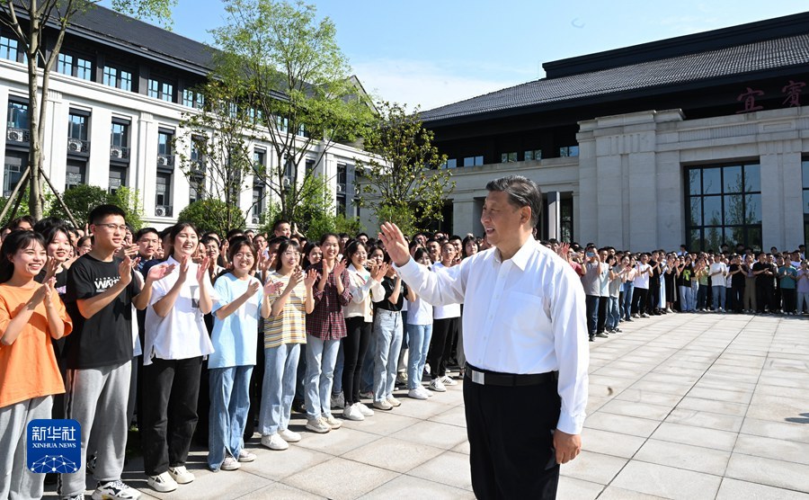 6月8日,中共中央总书记、国家主席、中央军委主席习近平在四川考察。这是8日下午,习近平在宜宾学院考察时,向师生们挥手致意。新华社记者 谢环驰 摄