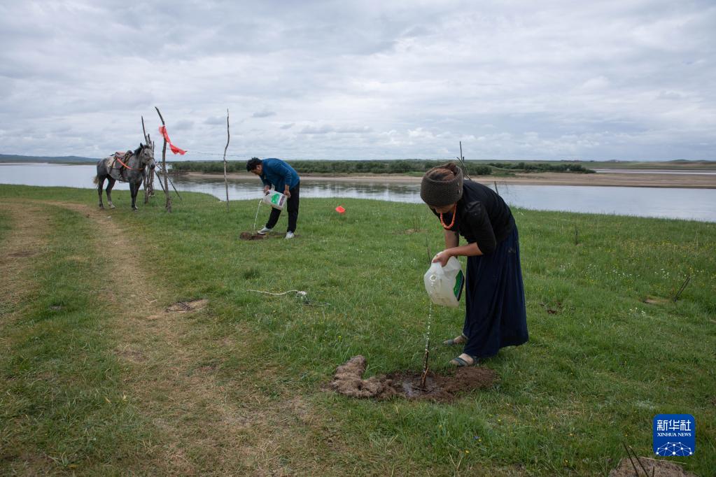 四川省若尔盖县麦溪乡嘎沙村巡河队的村民在黄河边给新种的柳树浇水(2022年7月26日摄)。新华社记者 江宏景 摄