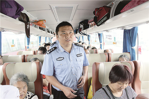 常宁市交警大队大队长阳纯卫在公交车上检查车辆安全。