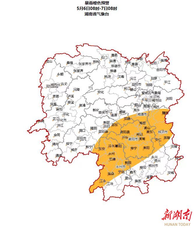 湖南日报5月6日讯(全媒体记者 肖秀芬 通讯员 林城)省气象台今天6时发布暴雨橙色预警:预计6日8时至7日8时,株洲、湘潭南部、衡阳、郴州西北部、永州、娄底东南部部分地区将出现暴雨,局地大暴雨,并伴有短时强降水、雷雨大风等强对流天气,请加强防范。