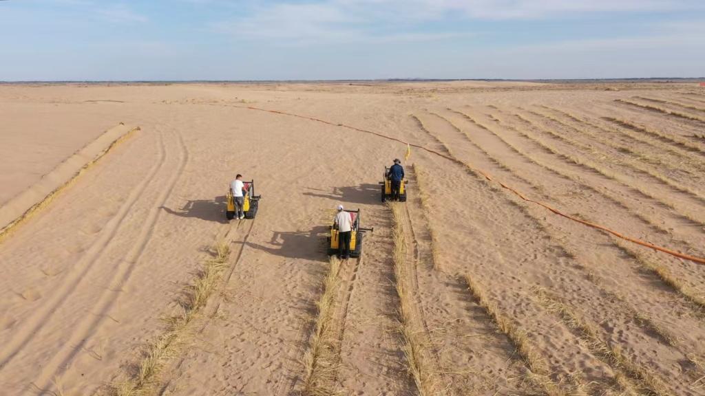 在内蒙古巴彦淖尔市乌拉特后旗西补隆林业管护中心,4台装有履带的压沙机正在沙地里“插秧”——小推车大小的压沙机前方都装有一个直径80厘米的大齿轮,压沙机前进一米,大齿轮就会将早已均匀铺在沙地上的稻草、秸秆精准“植”入沙地里。不一会儿,一条条金黄色的沙障“编织”完成,将沙丘牢牢缚住。