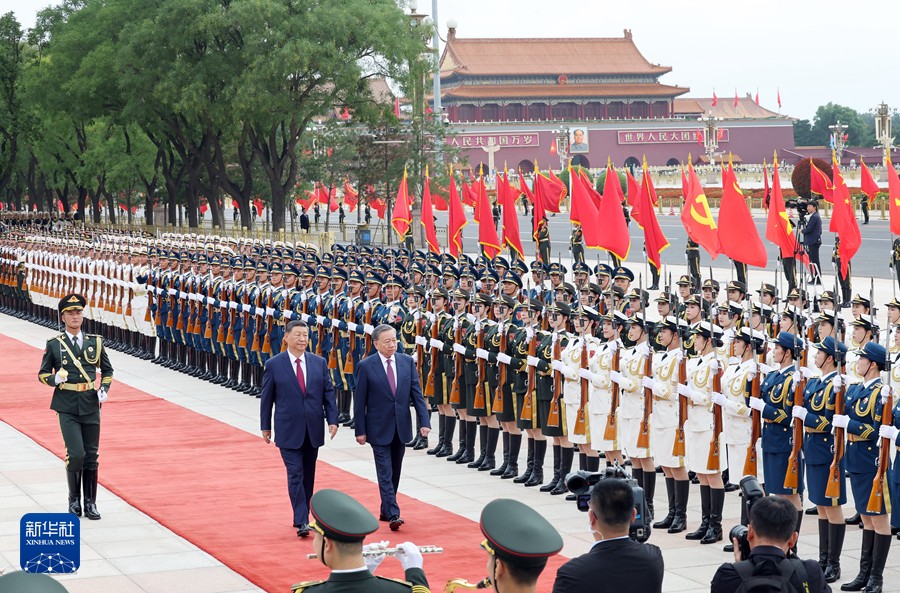 苏林抵达时,礼兵列队致敬。习近平同苏林登上检阅台,军乐团奏中越两国国歌,天安门广场鸣放21响礼炮。苏林在习近平陪同下检阅中国人民解放军仪仗队,并观看分列式。