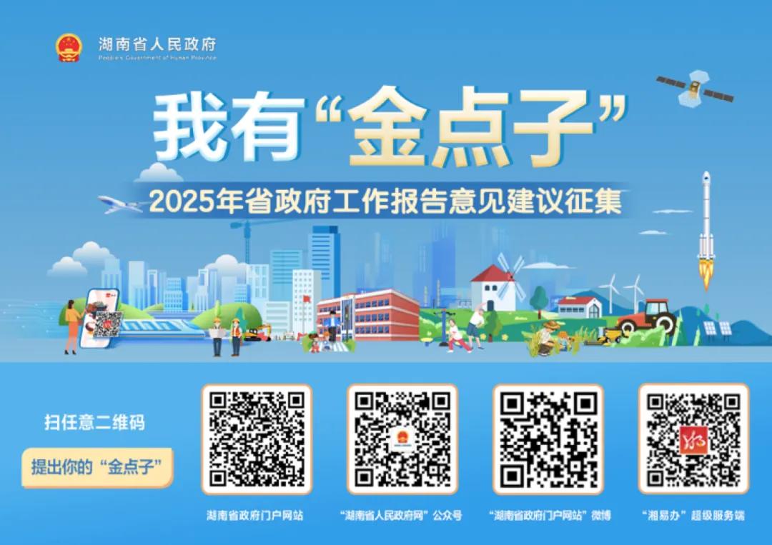 您对美好生活的向往,就是政府奋斗的目标。11月29日起,湖南省政府门户网站联合多家媒体与各市州、省直部门政府网站和政务新媒体以及“湘易办”超级服务端,开展“我有‘金点子’——2025年湖南省政府工作报告意见建议征集”活动,听取网民对政府工作的意见建议,科学谋划2025年省政府工作。即日起至2025年湖南省两会召开前,网民可以通过活动专栏对政府工作建言献策,一起为湖南高质量发展描绘新蓝图。