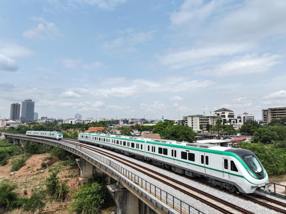 2024年5月23日,中国生产的动车组行驶在中企承建的尼日利亚阿布贾城铁轨道上。新华社发(郭晨摄)