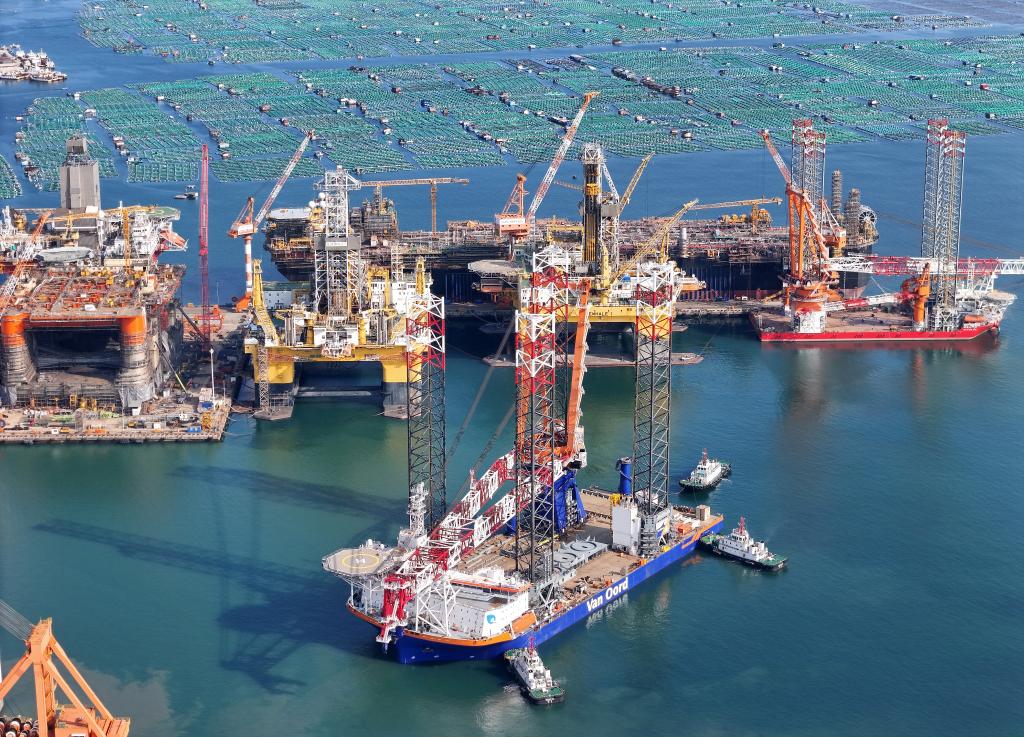 2024年10月16日,中集来福士山东烟台建造基地,多型海工装备和特种船舶在进行建造和测试(无人机照片)。新华社发(唐克摄)