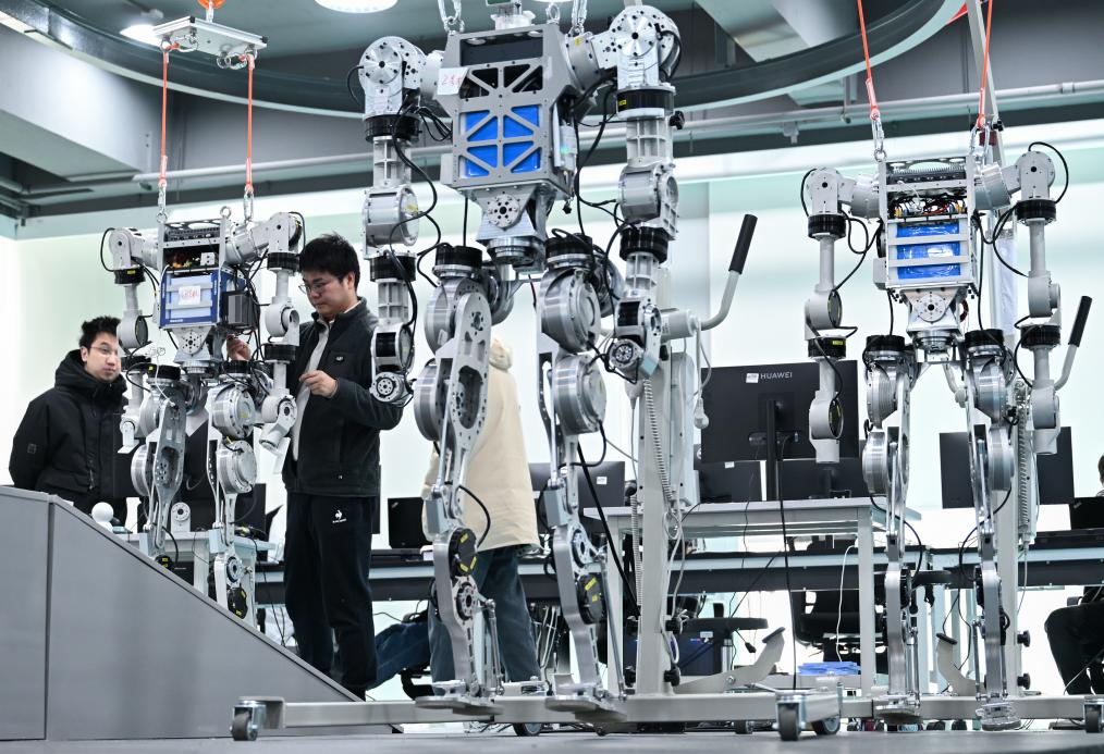 2025年2月24日,在武汉格蓝若智能技术股份有限公司,研发团队成员在调试人形机器人。新华社记者杜子璇摄