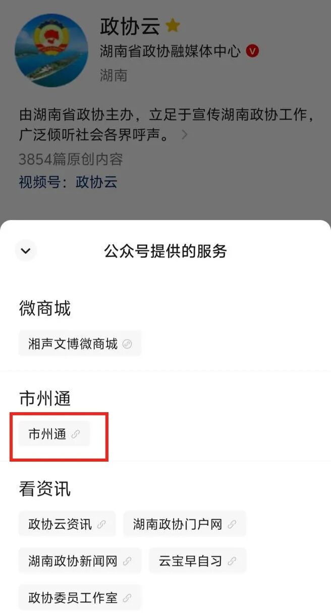 一是通过“我关注的公众号”,点击政协云微信公众号进入主页,点击下方中间位置“市州通”,再点击市州通链接,即进入市州政协公众号矩阵页面。