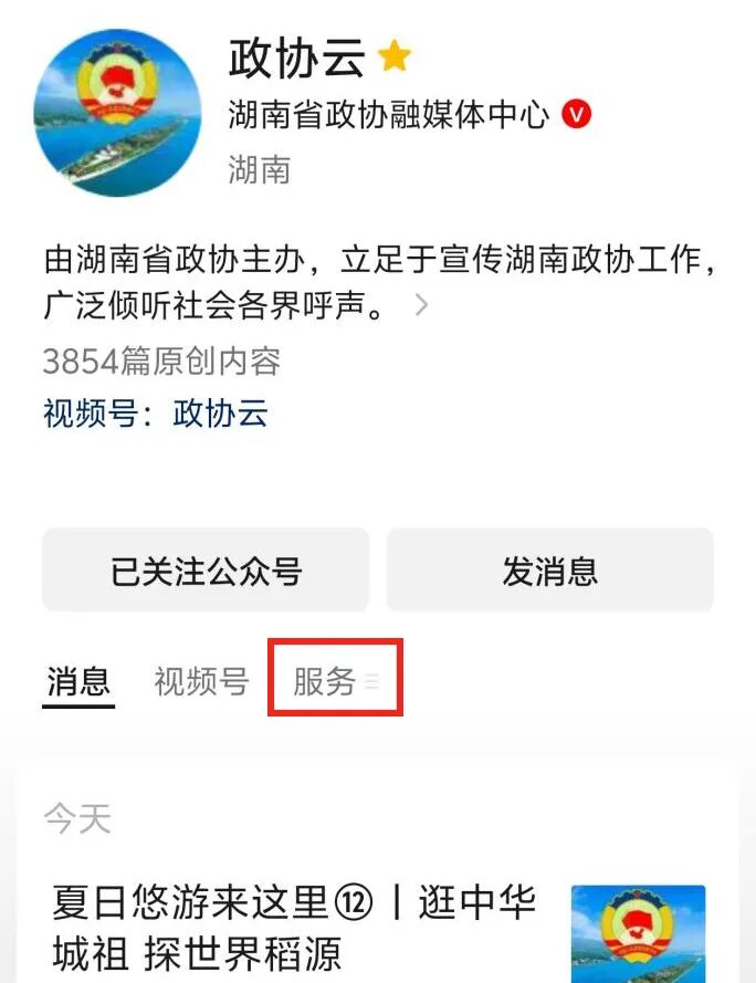 二是打开政协云微信公众号主页面,进入“服务”栏目,点击“市州通”下方的市州通链接,也可进入市州政协公众号矩阵页面。