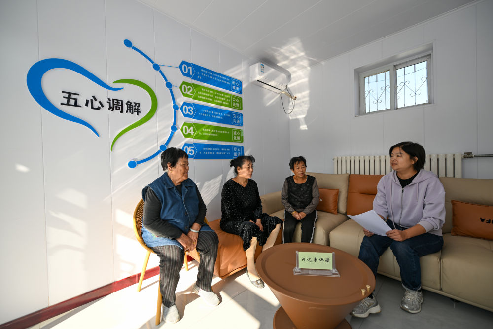 在天津市宁河区芦台街道金华路社区,社区党总支副书记吴蕊(右一)就社区监控设备安装问题为社区居民进行解答(2024年10月11日摄)。金华路社区积极践行新时代“枫桥经验”,将原社区居委会闲置用地提升改造成为联络群众的基层综合治理阵地——“解铃小院”。新华社记者 孙凡越 摄