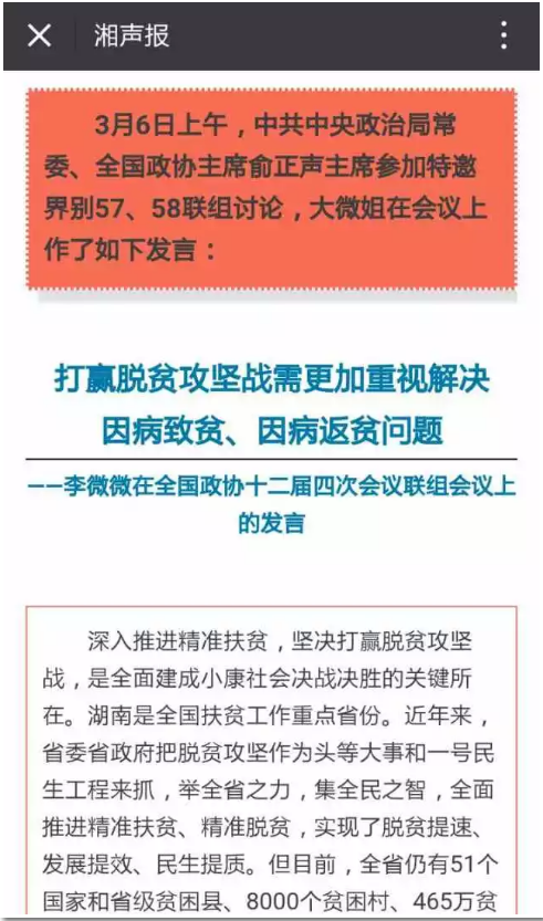 全国政协委员、湖南省政协主席李微微在2016年3月召开的全国政协十二届四次会议联组会议上,以《打赢脱贫攻坚战需更加重视解决因病致贫、因病返贫问题》为题发言,提出亟需对建档立卡贫困人口制定差异化医疗保障和救助政策,呼吁通过适当提高住院费用报销比例、加大重大疾病救助力度、制定专门针对贫困人口的大病救助方法等措施,加大对因病致贫返贫农民的救助力度。
