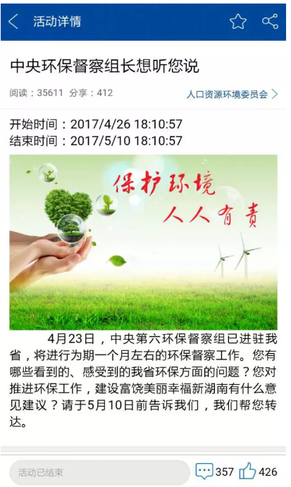 中央第六环保督察组进驻湖南当天晚上,省政协人资环委就及时在政协云上发布了“中央环保督察组长想听您说”讨论话题。