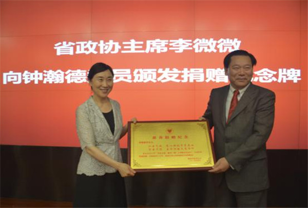 省政协主席李微微向钟瀚德授予捐赠纪念牌。