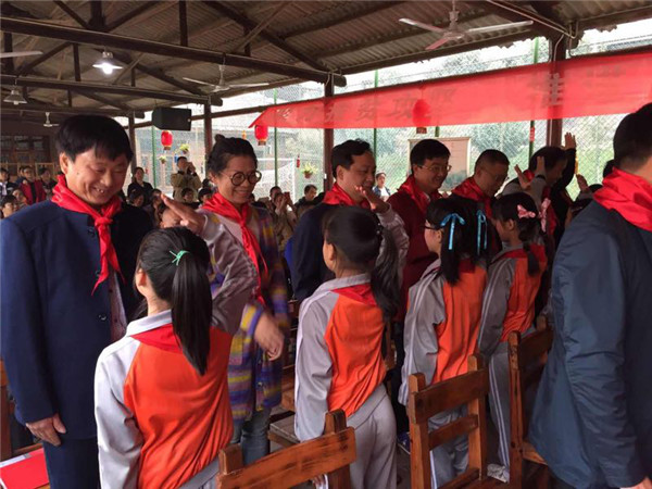 黎塘小学学生给政协委员系上鲜红的红领巾