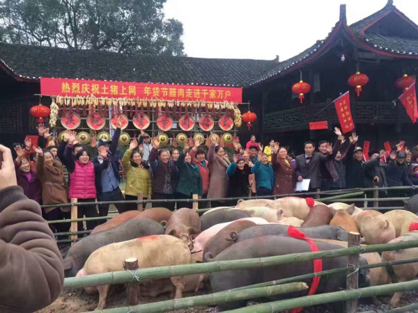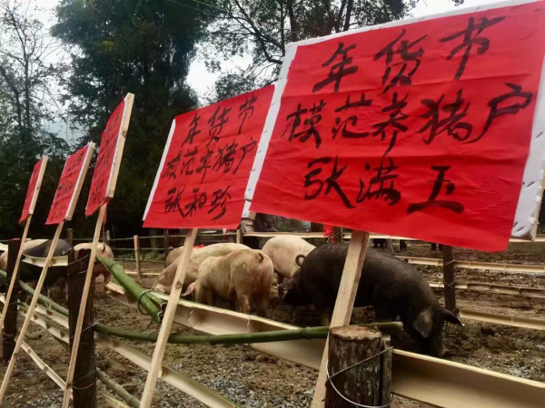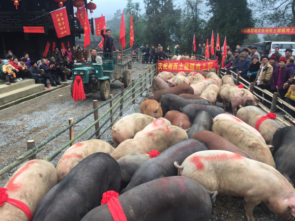 一块宽大的地坪里新填了些砂石,几条竹子做的通道里拥挤着100多头白猪和黑猪,有的身上披红挂彩。一辆四轮拖拉机缓慢的行进,一个中年男人神采奕奕站在拖拉机上,向通道里的猪挥手。猪的反应不一,有的好奇望着他,更多的撅着屁股不理睬,倒是竹通道外的男男女女老老少少,一个个向那个挥手的男人欢呼。