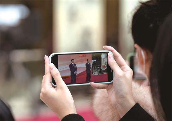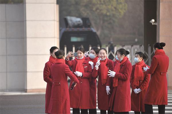 省两会的浓厚氛围,让工作人员也忍不住合影留念