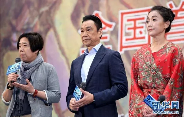 10月9日,导演苗月(左)和主演王学圻(中)、陈瑾(右)参加首映。当天,《十八洞村》在全国政协礼堂举行首映式。