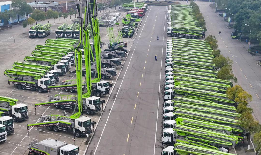 (中联重科麓谷工业园成品展示坪上,中联重科代表产品一字排开。湖南日报全媒体记者 辜鹏博 摄)
