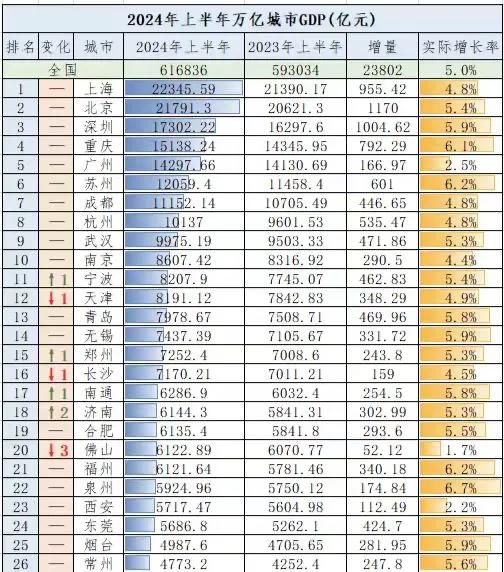 值得注意的是,同为中部省份的安徽上半年保持了快速增长,增速达到5.3%,GDP为23967亿元。排名与2023年相比,超过了上海,总量距离湖南也仅剩500多亿元的差距,可以说是在咫尺之间。