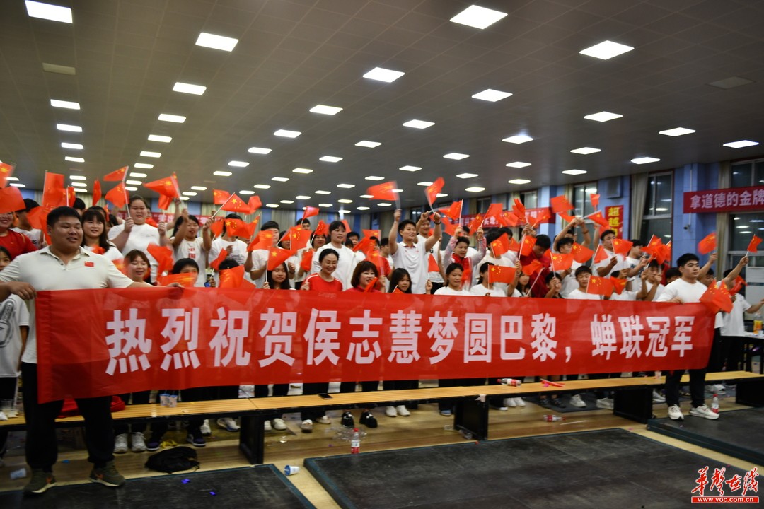湖南体育职业学院举重中心,是侯志慧梦开始的地方。“侯志慧,加油!加油!!”8日凌晨的湖南体育职业学院举重中心训练馆座无虚席,红旗飘扬,侯志慧的教练和队友们齐聚为侯志慧呐喊助威。