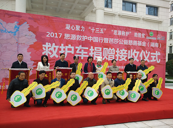 3月31日,在长沙举行的2017思源救护中国行暨芭莎公益慈善基金(湖南)救护车捐赠仪式上,13家国定贫困县医院各获捐1辆救护车。湖南成为继海南、宁夏之后,第三个率先实现“思源救护”捐赠范围覆盖全部国贫县的省份。