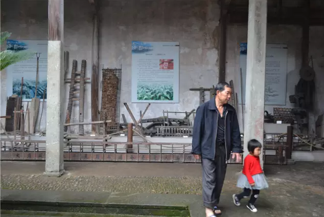 荻浦村,申屠氏宗祠(浙江省文物保护单位)里的老人与孩子。这里展示着当地耕作的老物件。