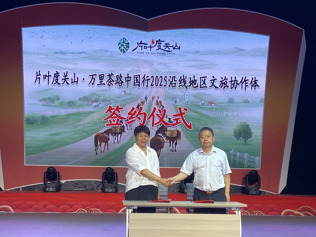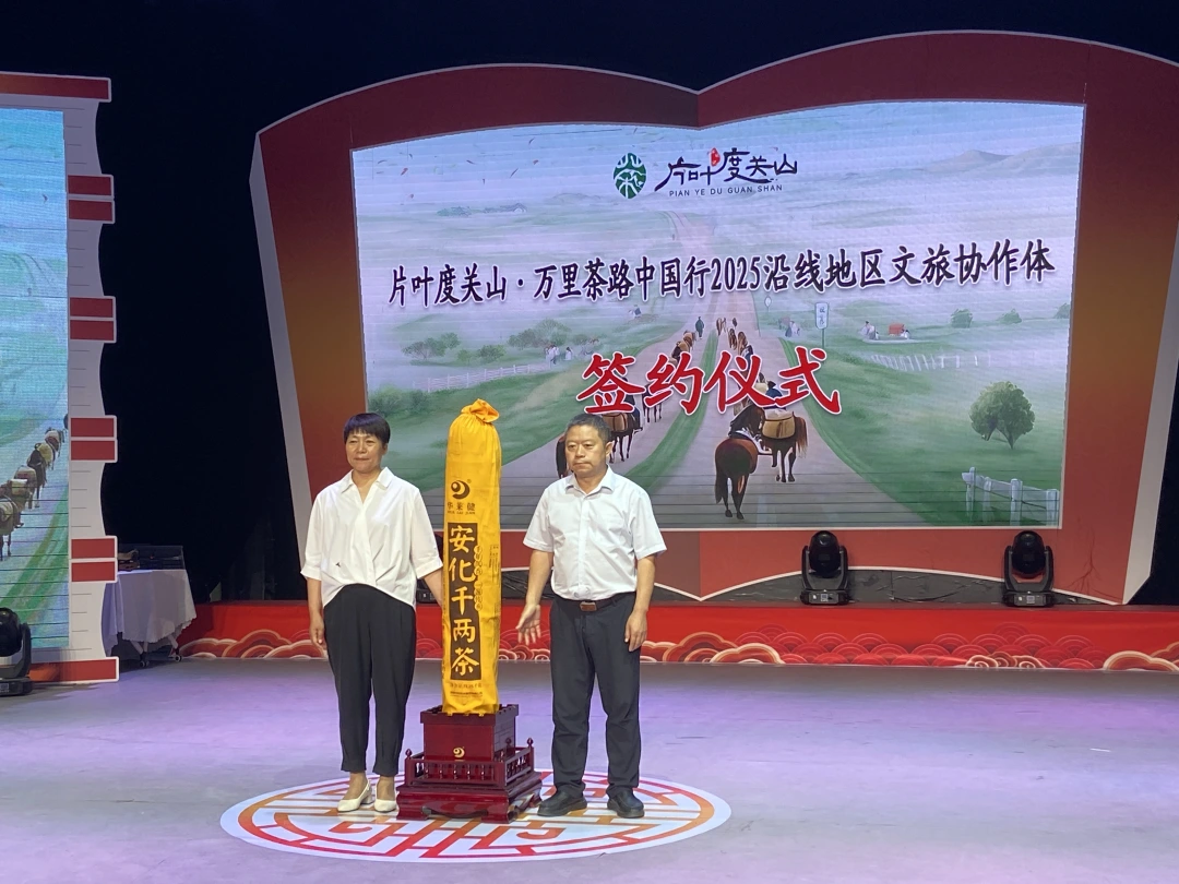 茶路连接南北,情谊跨越山海。会上,湖南安化赠送的千两茶、百两茶,湖南省炎帝陵基金会赠送《中华茶祖炎帝绣像》,玖恪品牌设计赠送湖南地图文创,象征南北文化因茶结缘,情谊深厚。西乌旗与安化的文旅协作签约,更标志着两地从文化共鸣走向实质合作。未来,两地将通过线路互联,整合两地特色旅游资源,打造跨区域的精品旅游线路;产品互推,借助各自的市场渠道,推广对方的文旅产品;品牌共建,共同塑造万里茶道文旅品牌,让草原风情与茶乡韵味在万里茶道上交相辉映,携手传承茶路文化,共促文旅发展。