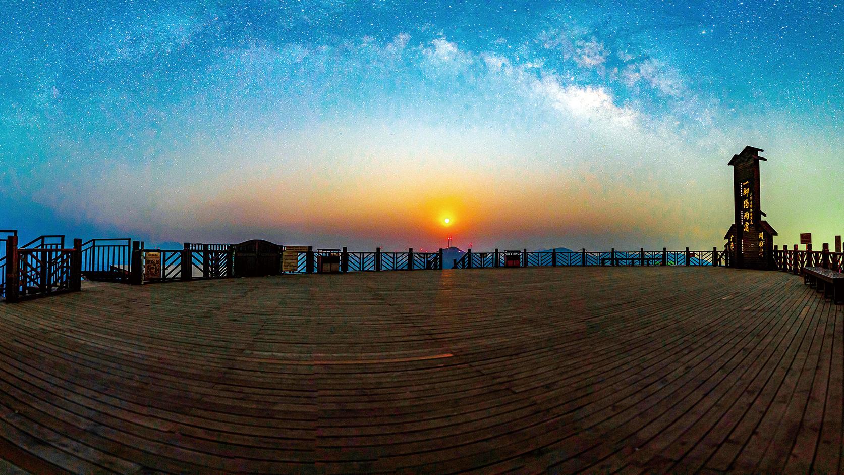 炎热的夏季,云冰山的气温在20℃左右,避暑的同时,这里也是绝佳的星空观赏地。图为云冰山顶的一脚跨两省观景台。