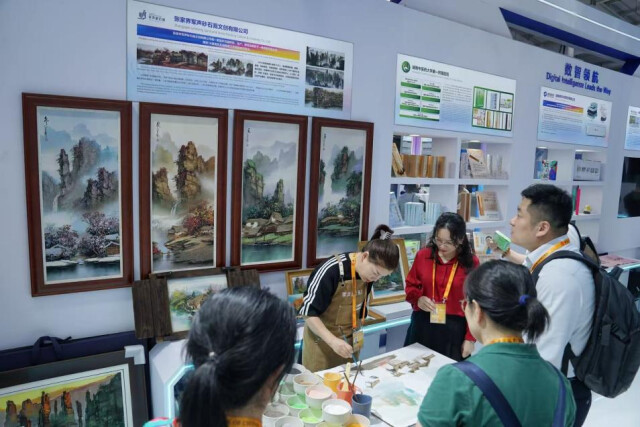 张家界军声砂石画文创有限公司是第一次参展服贸会。“服贸会给我们提供了特别好的平台,希望借助这个大平台,多找到一些‘好朋友’。”公司副总经理刘国群介绍,公司生产的砂石画以砂、石、植物为材,研发出门窗、瓦片等不同形式的千种产品,畅销海内外市场。