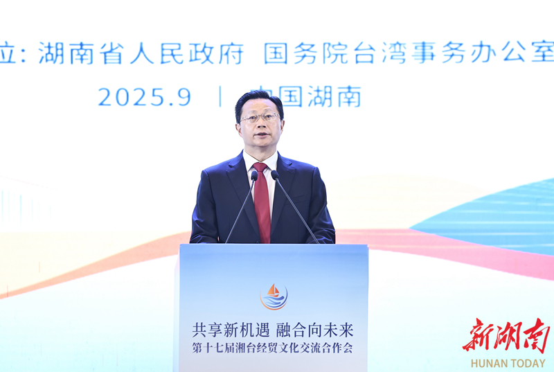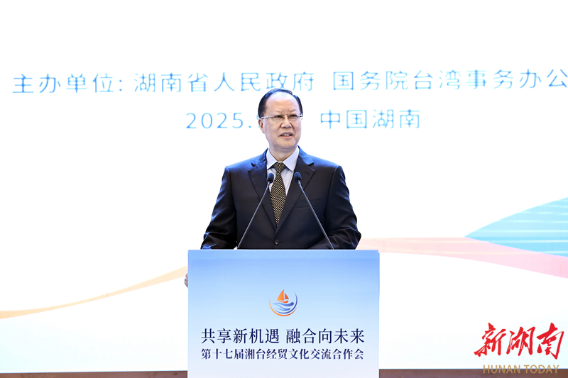 致辞中,毛伟明用“三看”寄语湘台合作美好明天。他说,看发展,湖南已经站在新的历史起点。近年来,湖南锚定“三高四新”美好蓝图,加快构建“4×4”现代化产业体系,前瞻布局“4+4科创工程”,去年经济总量达5.3万亿元。看合作,湘台交流取得新的丰硕成果。两地人缘相亲、文缘相承、商缘相通,在湘台资项目累计达3223个、台企超700家、投资规模超千亿元;台湾已成为湖南入境游第二大客源地、双向旅客超500万人次,超10万台胞来炎帝陵寻根谒祖。看未来,湘台合作迎来新的历史机遇。希望双方以本届大会为新起点,深化产业链供应链技术链对接融合,推动全面恢复湘台直航和各领域贸易合作,加强根祖文化、抗战文化、民俗文化、非遗文化等领域交流,携手塑造产业合作的示范地、畅通贸易往来的共赢路、架好民间交往的连心桥。