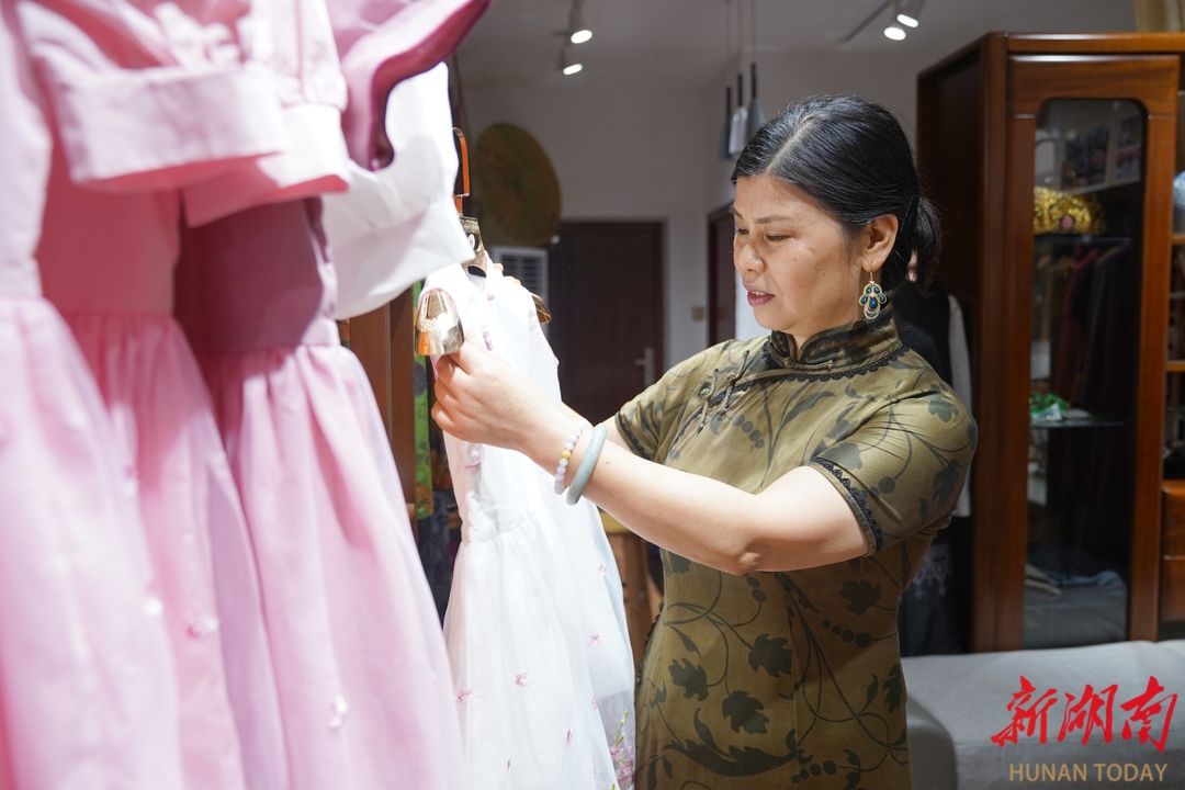 做美人扣,只是钟雪萍手中的一件小活儿。她主理旗袍,在宁乡名气不小,对传统工艺镶、嵌、绲、宕、盘娴熟于怀。主理的旗袍卖得好,每年出手上千件,丝绸面料的一件好几千,比做其他服装生意,赚钱来得快。