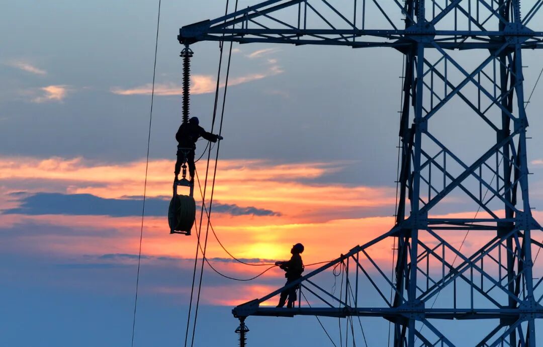 10月15日,衡阳市蒸湘区雨母山镇,施工人员在进行高塔架线作业。曹正平 彭国平 摄(湖南图片库)