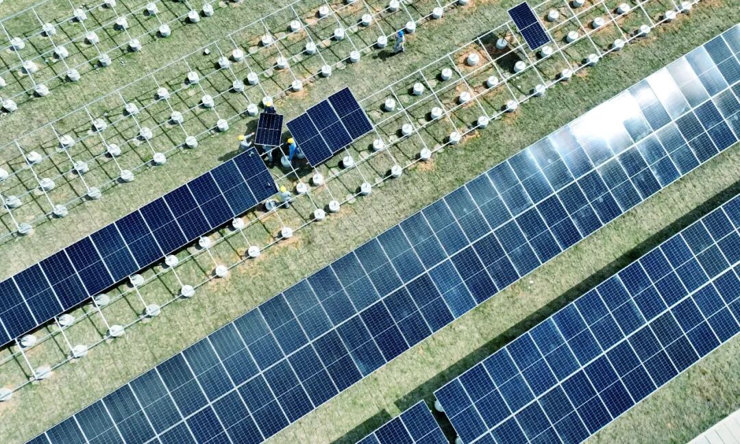 8月21日,湖南石化己内酰胺新区办公区绿化带光伏电站施工现场,工人在安装光伏板。彭展 李翼骏 摄(湖南图片库)