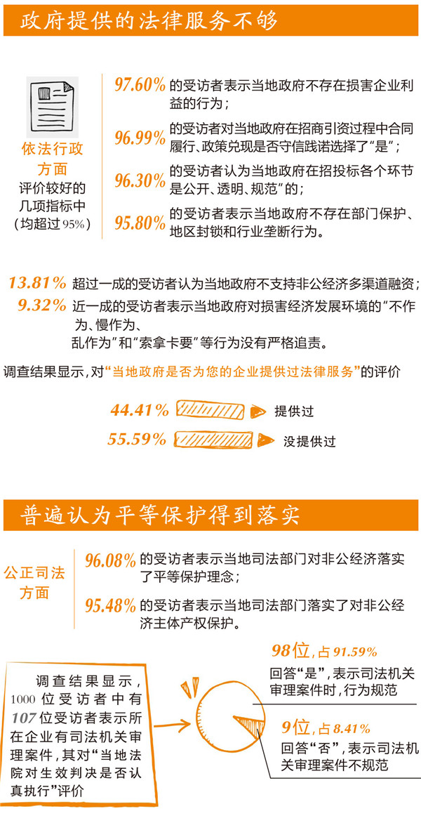 李微说,企业如果与司法部门直接打交道,90%以上都是涉及民商事的案件,在这类案件中,政府部门是否及时提供法律支持,司法部门是否落实对非公经济主体的平等保护理念,这些都可以反映非公经济面临的法治环境的好坏。