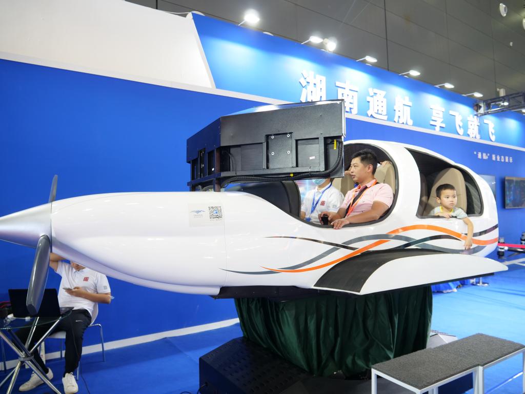 7月16日,在湖南长沙国际会展中心,市民体验模拟驾驶飞机。新华社记者丁春雨摄