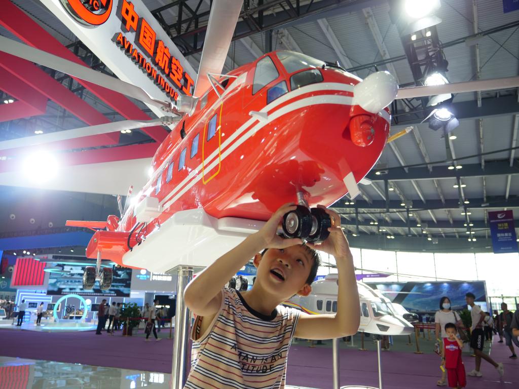7月16日,在湖南长沙国际会展中心,小朋友观看航空模型。新华社记者丁春雨摄