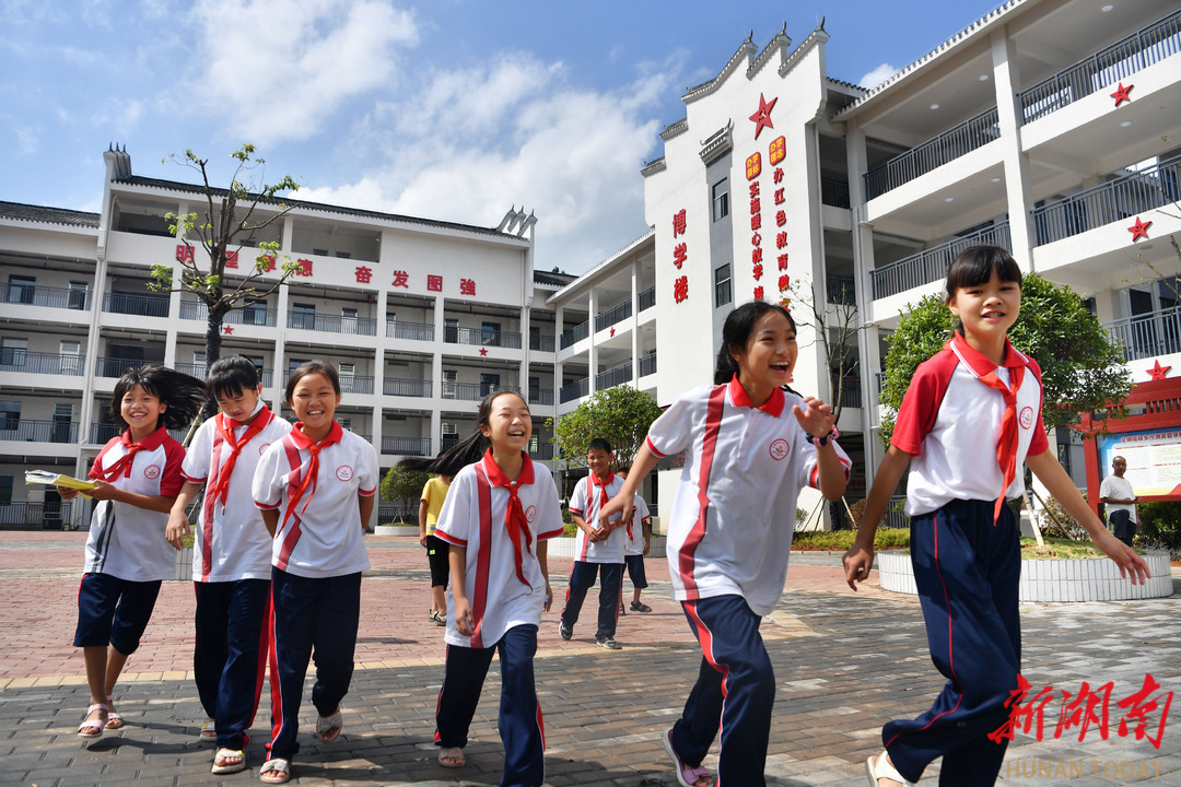 (2021年9月1日,汝城县文明瑶族乡沙洲村,新落成的沙洲芙蓉学校正式启用,陆续迎来报到的新生。 湖南日报全媒体首席记者 郭立亮 摄)